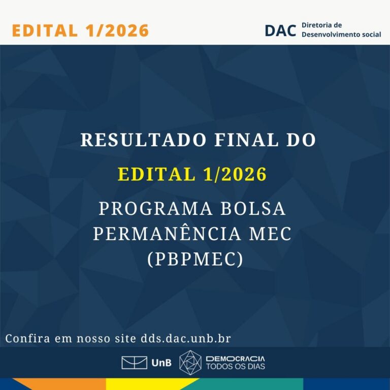 Publicado o EDITAL Nº 03/DAC/2026 – EDITAL DE AVALIAÇÃO SOCIOECONÔMICA PARA ACESSO AOSPROGRAMAS DE ASSISTÊNCIA ESTUDANTIL. Acesse menu > editais > 2026.1.