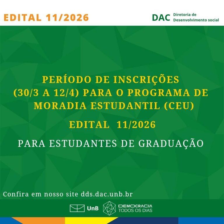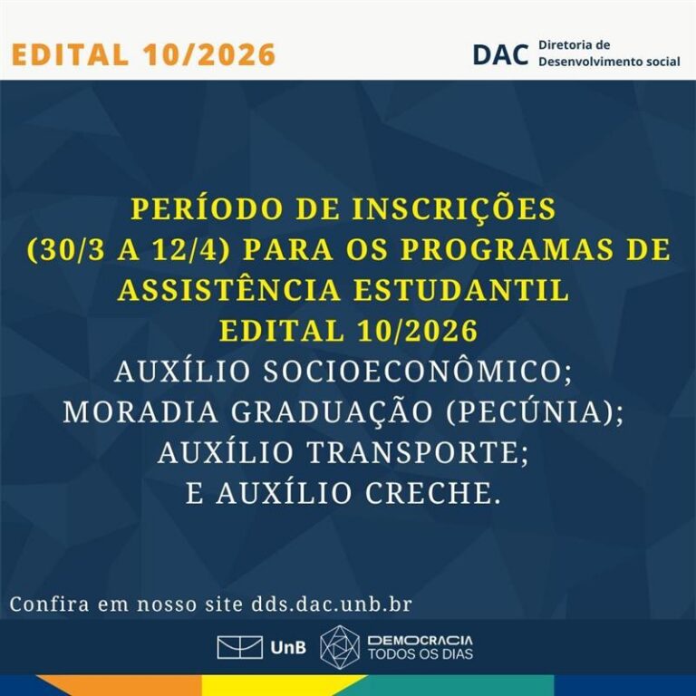 Publicado o EDITAL Nº 10/2026 – INCLUSÃO NOS PROGRAMAS AUXÍLIO SOCIOECONÔMICO, MORADIA ESTUDANTIL DA GRADUAÇÃO MODALIDADE PECÚNIA, AUXÍLIO TRANSPORTE E AUXÍLIO CRECHE. Acesse menu > editais > 2026.1.